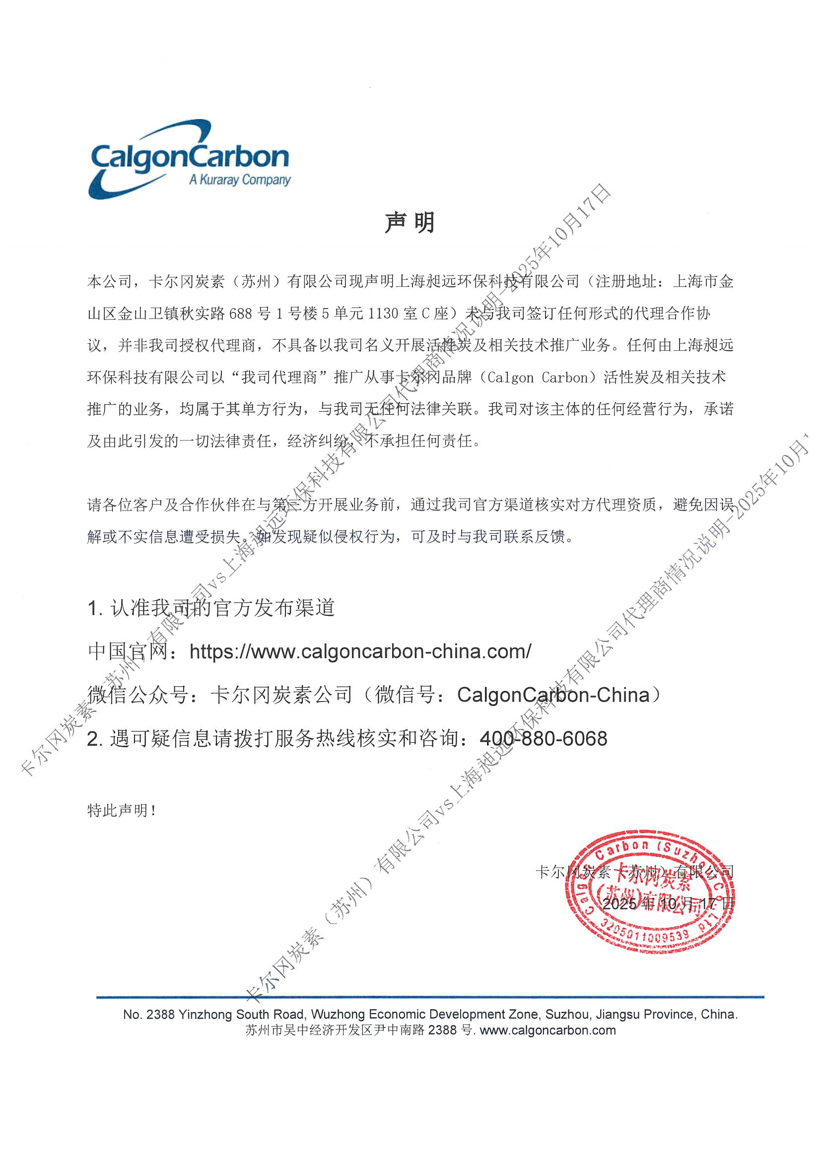 上海昶远环保科技有限公司非卡尔冈炭素公司授权代理商